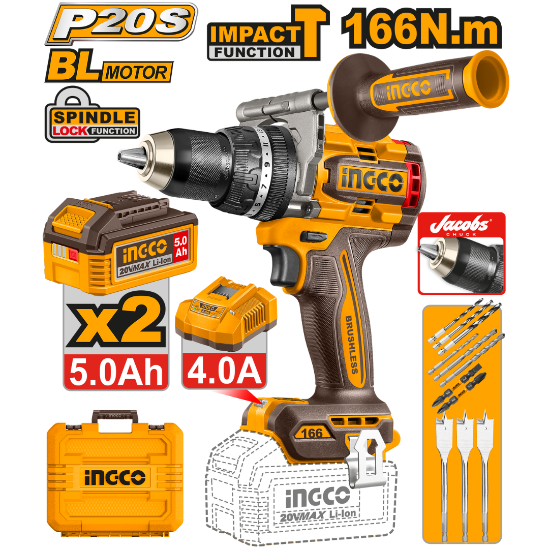 | Brushless motor Voltage: 20V No-load speed: 0-550/0-2100rpm Max impact rate: 31500bpm Max torque: 166Nm Jacobs metal chuck Chuck capacity: 13mm Torque settings: 23+1+1 Mechanical 2-speed gear Spindle lock function Integrated LED work light LED battery power indicator Include: 2 Pcs 5.0Ah battery pack(FBLI20031) 1 Pcs charger(FCLI20411) Charge volts: 220-240V~50/60Hz 3 Pcs wood flat drill bits(16.19.22mm) 3 Pcs masonry drill bits(5.6.8mm) 3 Pcs HSS drill bits(4.5.6mm) 2 Pcs 65mm impact screwdriver bits(PH2+PH2,PH2+SL6) 1 Pcs auxiliary handle Packed by carrying case |