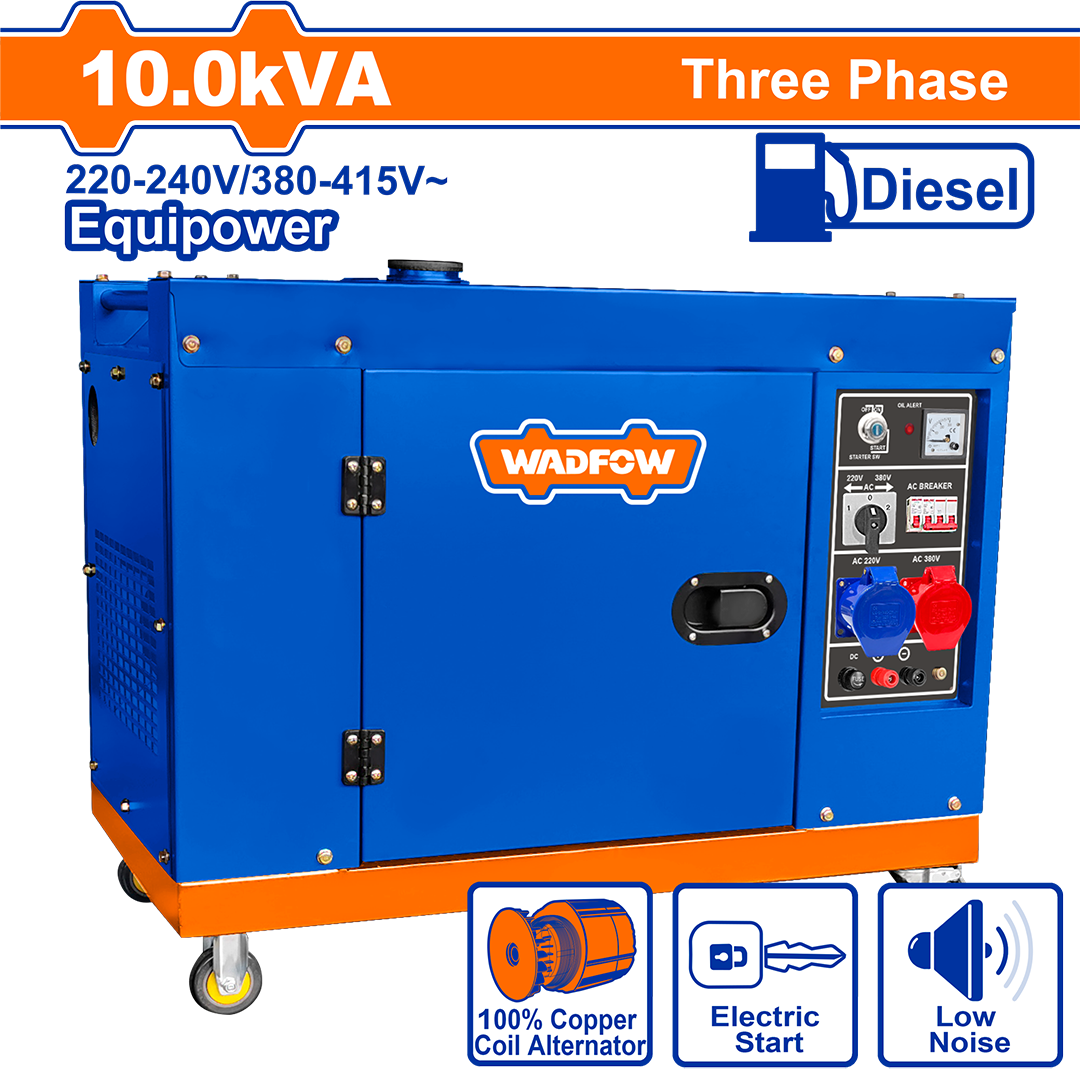 | Rated voltage: 220-240/380-415V~ Rated frequency: 50Hz Phase: three Max.output: 10kVA@380-415V Rated output: 9.4kVA@380-415V Max.output: 9kVA@220-240V Rated output: 8.5kVA@220-240V Rated speed: 3000rpm DC output: 12V, 8.3A Engine: diesel 15.0HP Displacement: 668cc Cooling system: air-cooled Starting system: electric Copper coil alternator Fuel tank: 25L Dry weight: 236kg 36Ah maintenance-free battery Silent type diesel generator Packed by carton box |